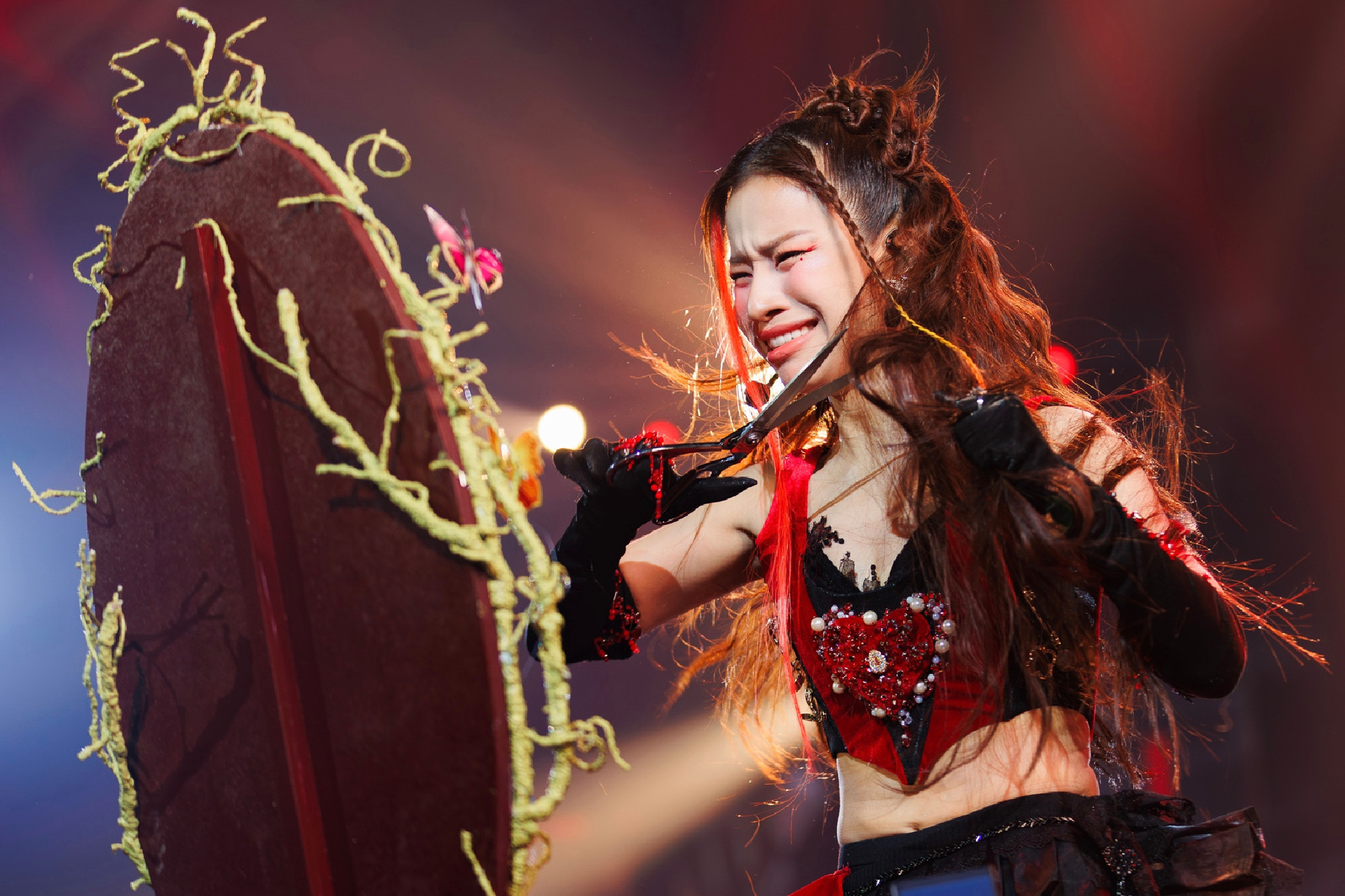 Lâm Bảo Ngọc cắt tóc thật trên sân khấu. Nữ ca sĩ giải thích, hành động này không để cổ suý mà thể hiện sự "điên rồ nhất định trong nghệ thuật".