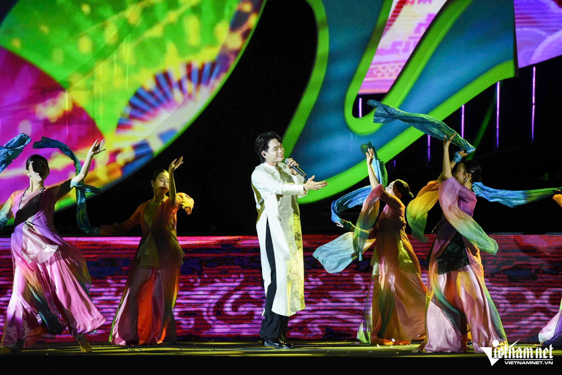 Ngay sau phần phát biểu, sân khấu bừng sáng với màn trình diễn ánh sáng kết hợp trống hội “Hào khí Kinh Bắc”, mở màn cho một đại tiệc nghệ thuật kéo dài 90 phút.