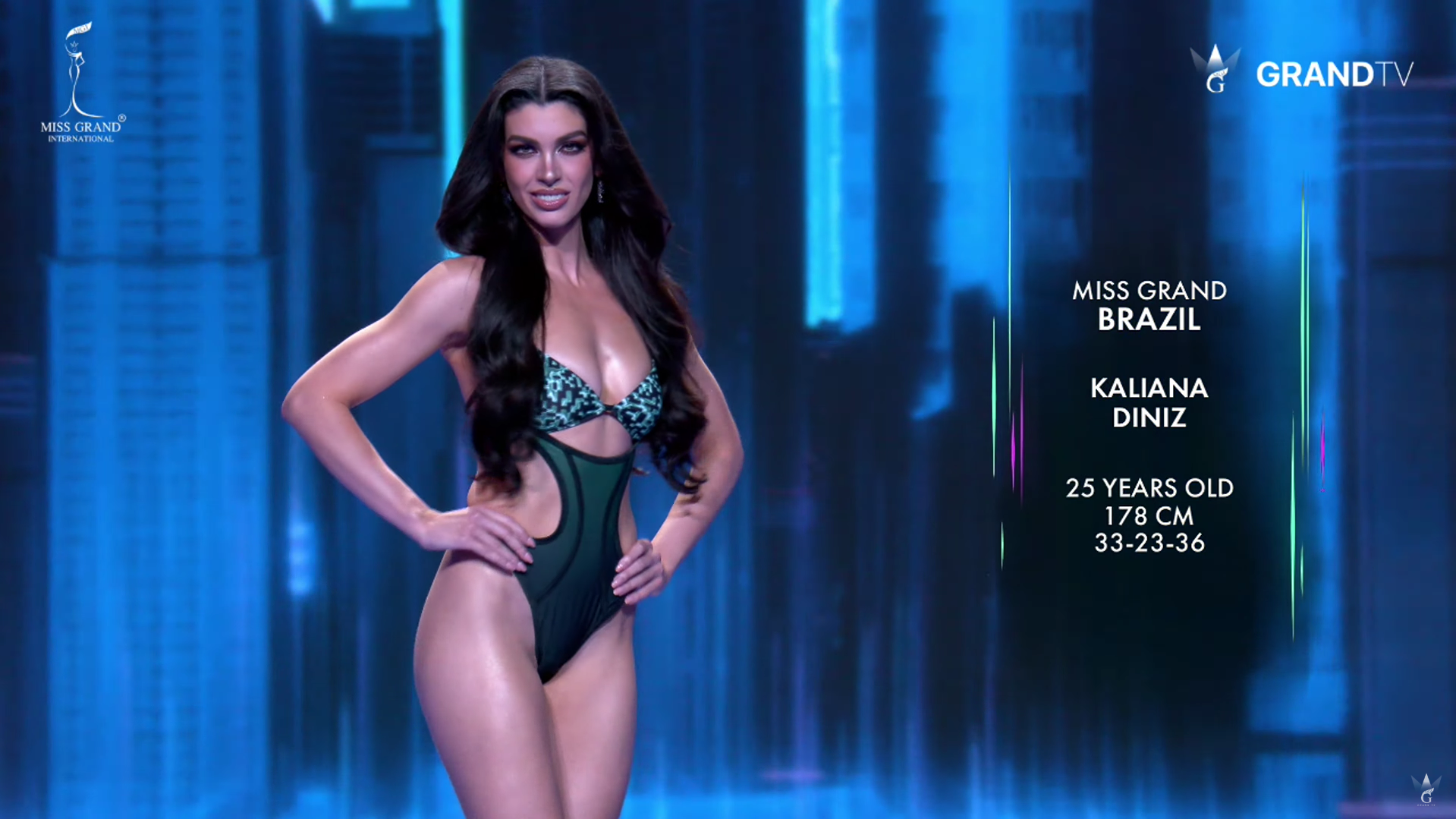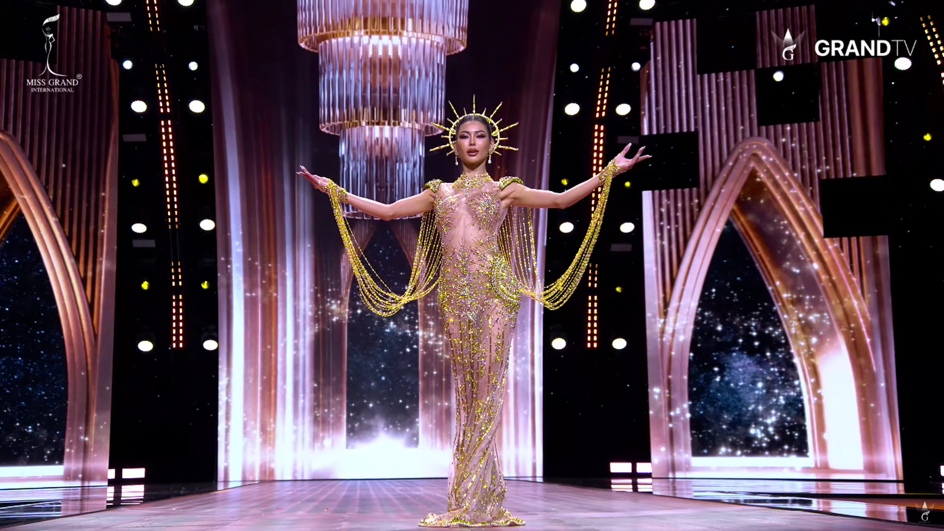 Tối 15/10, bán kết Miss Grand International 2025 (Hoa hậu Hòa bình Quốc tế) diễn ra tại Bangkok (Thái Lan) với 2 phần thi chính là trình diễn trang phục áo tắm và dạ hội. Trên sân khấu được dàn dựng hoành tráng, lấy cảm hứng từ công nghệ AI, 77 thí sinh mở màn bằng màn trình diễn áo tắm đầy năng lượng.